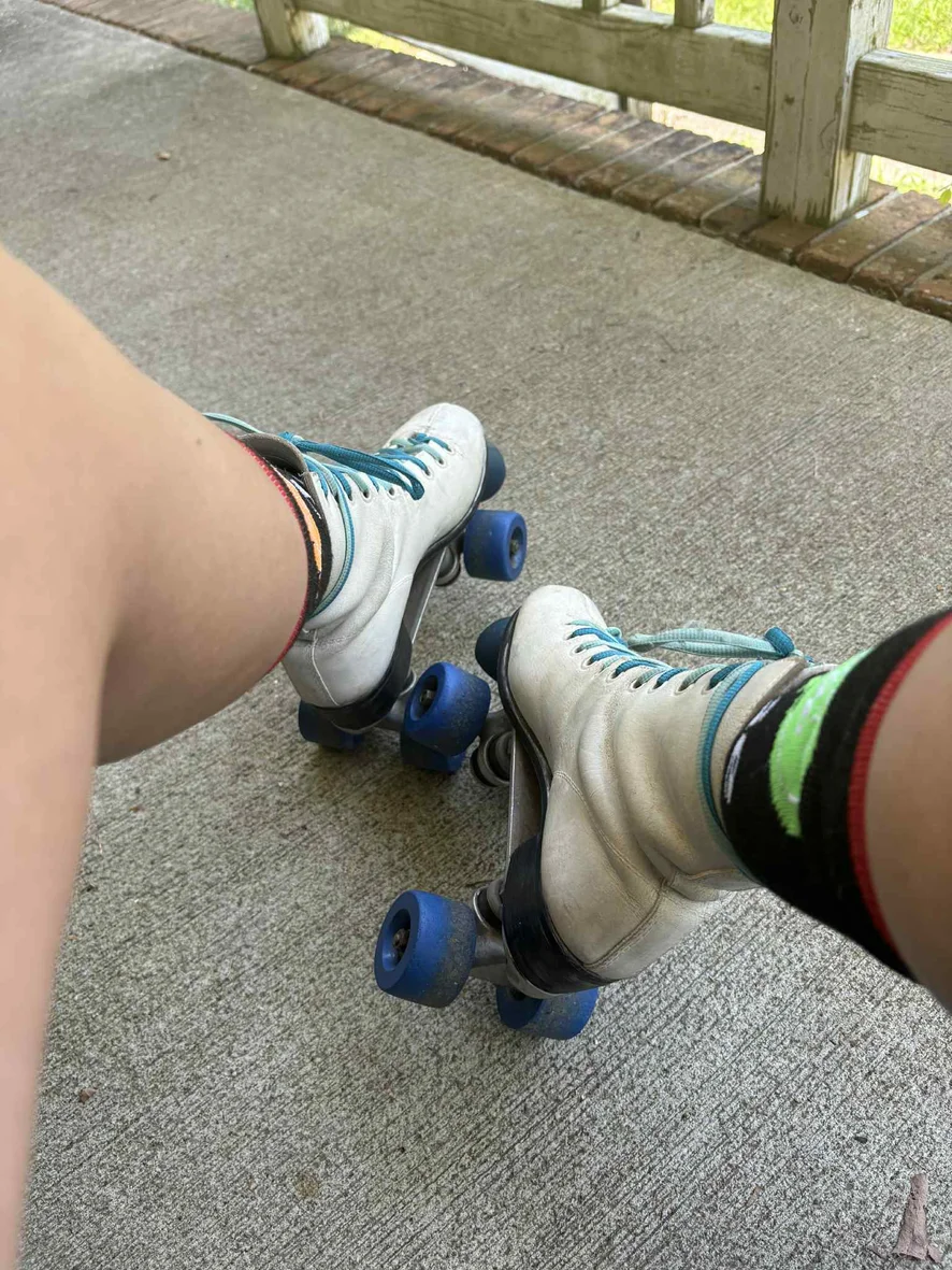 ook at my roller skates you can't tell I've been around the block of time or two?